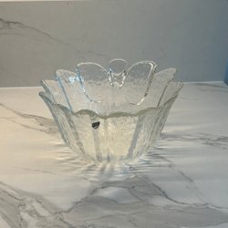 Vacker blå glasvas med en unik, vågig form. Vasen har en räfflad yta som ger den ett elegant utseende.
