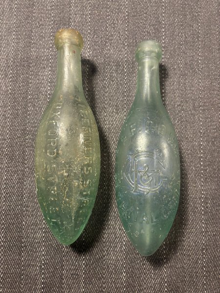 Antique torpedo bottles. Both have damage to the top, but mostæy intact. One is Schweppes.