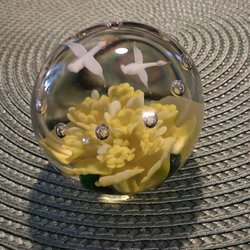 Vacker brevpress i glas med gult och vitt mönster som en blomma