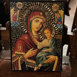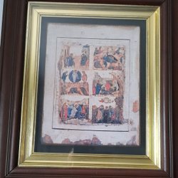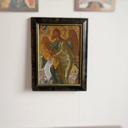 En vacker ikon med en religiös motiv. Den har en gyllene bakgrund och är målad med detaljerade drag. På ikonen står det skrivet 'CB.' och 'IOBAH'.
