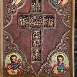 Denna konstverk är en handmålad ikon-reproduktion, gjord på ett tungt träslag. Troligen med grekisk förlaga.