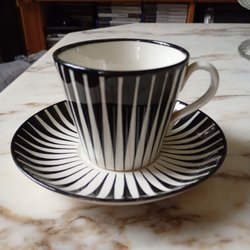 Kaffekopp från Gefle i modellen ZEBRA. Koppen är vit med svarta ränder och har ett handtag.
