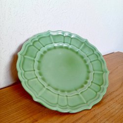 Assiett med ett charmigt gult blommönster i mitten. Tallriken har en gul rand längs kanten och en smal grön linje innanför den gula randen.