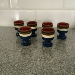 Fyra äggkoppar från Nittsjö. Två av äggkopparna är bruna med vita ränder. Alla har stämpel i botten, de blå har dessutom liten etikett. Lite eller aldrig använda.