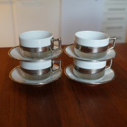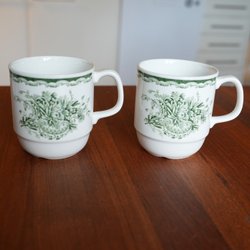 Tallrikarna ø ca 20 cm. Mugg höjd ca 8 cm. Den djupa tallriken har ett nagg på undersidan. Färgen har delvis lossnat på den gröna kanten. I övrigt riktigt fint skick.