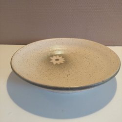 Charmigt set med kaffekanna samt tre koppar med fat. Lergods med målat mönster i vitt, citrongult, varmgult och grått. Inte ett set för perfektionisten. Har nåt naivt över sig. Lite klumpigt. Glasyren är ojämn, finns små fnorpar och skevheter i ytan. Men, det är så den är gjord. Och, enligt mig superfin! Gissar på 60-tal. Kannan har en stämpel, men bara kanterna syns, så vågar inte gissa på härkomst.