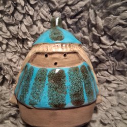 En dekorativ keramikfigur med ett unikt utseende. Den har en brun kropp med blå prickar och en guldfärgad huvud.