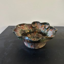 Dekorativ keramikskål med romantisk form och marmorering i blått och brunt. Jättefin glasyr och signerad av konstnären. Mått 18X5,5cm.