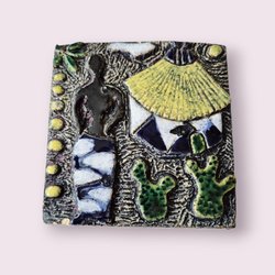 Beskrivning: Väggplakett av Eva Hellbom. Motiv med kvinna, hus samt växter.