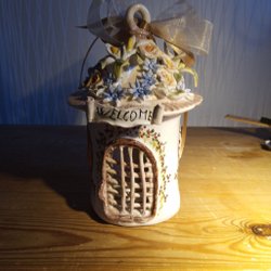 Söt keramik ägg med blommor och rosett. Konsthantverk, från Umbrien Italien. Höjd 8 cm.