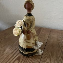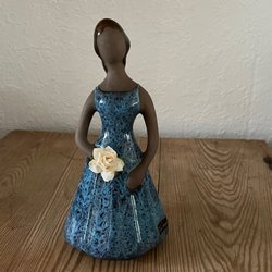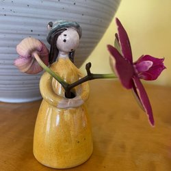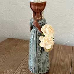 Denna keramikfigur, känd som "Blomsterflicka", designades av den svenske konstnären Gunnar Nyman. Den tillverkades mellan 1960- och 1970-talen och användes ibland som vas eller ljusstake, vilket framgår av hålen i dess kant, vilka fungerar som blom- eller ljushållare.
