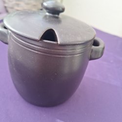 En keramikburk i mörka toner med inslag av gult och grönt. Burken har en glaserad yta upptill och en matt, oglaserad botten.