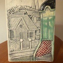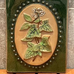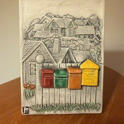 En vacker keramiktavla med ett detaljerat motiv av ett landskap med ett träd, hus och en båt. Tavlan har en upphängningsanordning på baksidan.