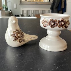 Ljusstake från Rosa Ljung med blommor. 10 cm hög. Plattan för ljuset är 7 cm i diameter. Perfekt för blockljus