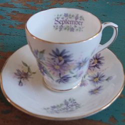 Kopp med fat från Hackefors Porslin. Koppen är dekorerad med blommor och har guldfärgade detaljer.