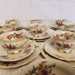 Elegant servisset i klassiskt Bavaria-porslin med gulddekor och ljusgrå/cremefärgad ornamentik runt kanterna. Vacker och tidlös design – perfekt till finare dukning, samlare eller för dig som vill ha en komplett servis i hög kvalitet.