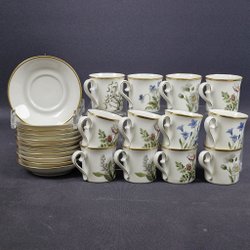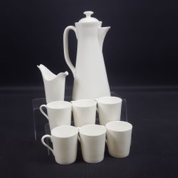 1 kaffekanna, 10st koppar, 12st tefat, 12st assietter, 1 gräddkanna, 1 sockerkål. Ej funktionstestade. Bruksslitage så som repor och fläckar. Se bilder.