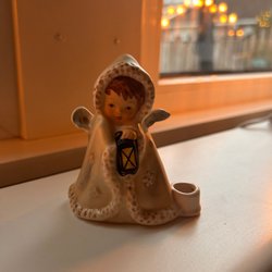 Goebel ljusstake i form av en ängel. Den har en blå klänning med vit kant och en matchande mössa. Ängeln håller en ljusstake.