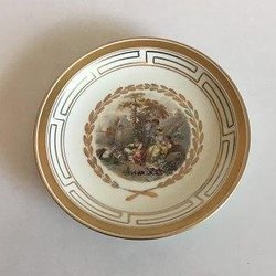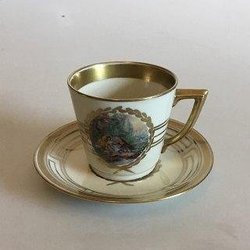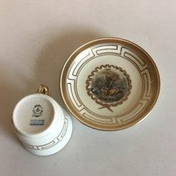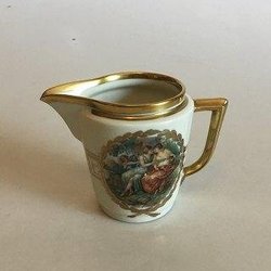 Meissen Porcelænskop i overglasur med klassisk mytologisk motiv. Afbildning af en munk der hælder vand i et fad fra en krukke med løvehoved, samt en løbende ynling med fødder formet som klove. Indvendigt afbildet en rose. Undersiden med blåt Meissen mærke. H: 4,5 cm. Minimale afslag på fodranden.