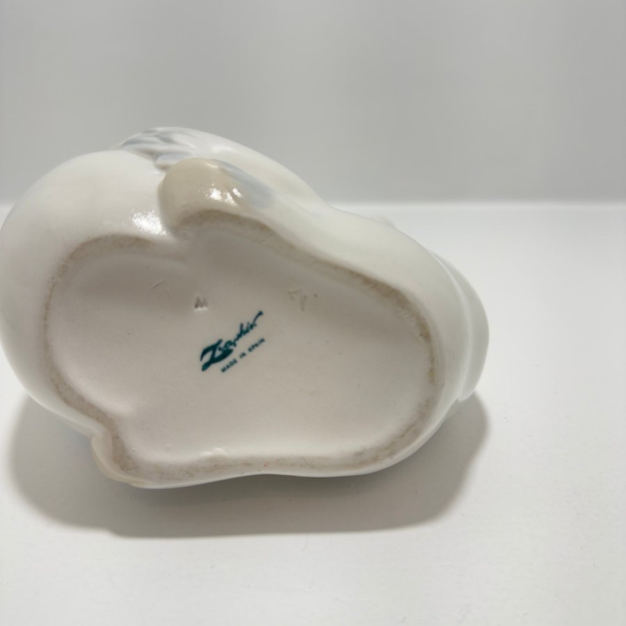 Elegant porslinsfigur i form av en svan, tillverkad av Zaphir, Spanien. Zaphir grundades på 1970-talet i Valencia och hade nära koppling till det välkända märket Lladro. Figuren har mjuka linjer, graciös form och handmålade detaljer i vitt och grått – en stilren inredningsdetalj och ett fint samlarobjekt.