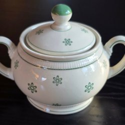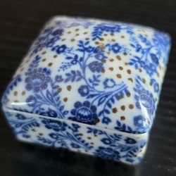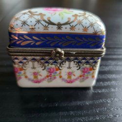 Vintage ask i helt benvitt proslin med små blommor och ornament på både locket och skålet. Kan med fördel användas till plockgodia eller förvaring av smycken.