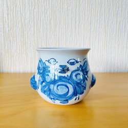 En söt keramikkruka med handtag och målade detaljer. Okänd tillverkare men signaturer i botten.