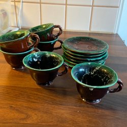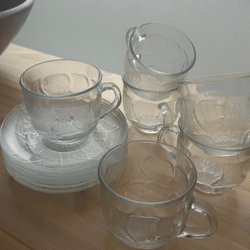 Koppar med tillhörande fat med blommigt motiv.
