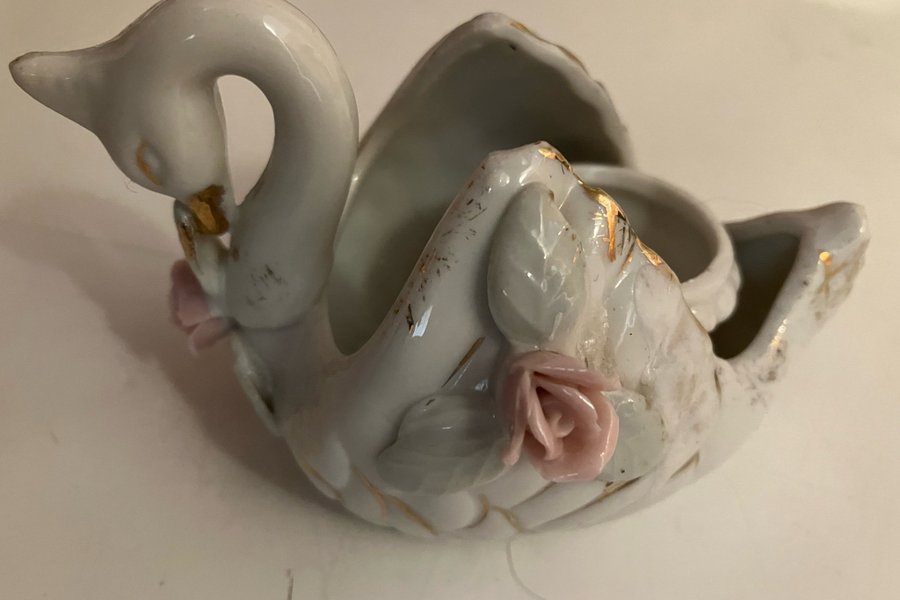 Svanformad prydnad i vitt med guldfärgade detaljer och rosa blommor. Föremålet har en öppning som kan användas för förvaring.