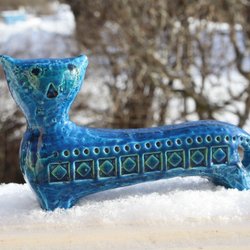 Vacker italiensk keramikskål i blått med detaljerat mönster. Skålen har en unik design som passar bra som inredningsdetalj. Mått: höjd 11 cm, bredd 15 cm resp 9 cm. Liten defekt i produktionen, se bild.