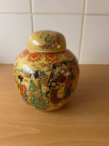 En dekorativ burk med lock. Burkens design har ett asiatiskt motiv med figurer och detaljer i guld, rött och blått.