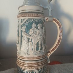 En tysk ölsejdel med blå bakgrund och motiv av hus, människor och växter.