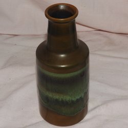 En keramikvas med en unik design. Vasen har en rektangulär form med en smal hals. Glasyren är i nyanser av brunt och beige, med en texturerad yta som ger ett rustikt intryck. Den mörka glasyren flyter ner över den ljusare basen, vilket skapar ett konstnärligt mönster. Vasen är ett dekorativt inslag i hemmet.