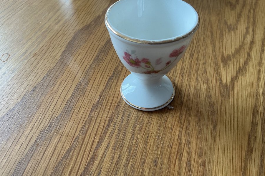 Äggkopp i vitt porslin med ett blommönster i rosa och grönt. Äggkoppen har guldfärgade detaljer längs kanten upptill och på foten.