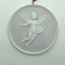 Bing og Grøndahl Biscuit Platte Nat No 123. Kopi fra 1840 after Thorvaldsens original fra Rom 1815. Måler 20,5cm (8.46 inch). Gravstedsplatte. Monteret med lædersnor