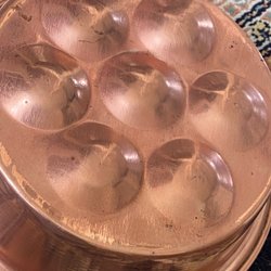 En äggpanna i koppar med plats för sju ägg.