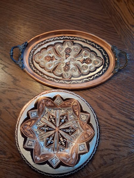 Dekorativa fat i koppar med detaljerade mönster.det med handtag har måtten 27,5x15 cm