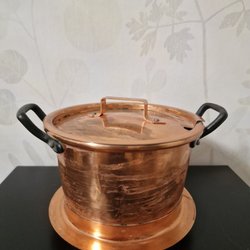 Koppargryta med handtag och tillhörande lock. Grytan har en kopparutsida och en insida i en annan metall. Locket är också i koppar med ett handtag.