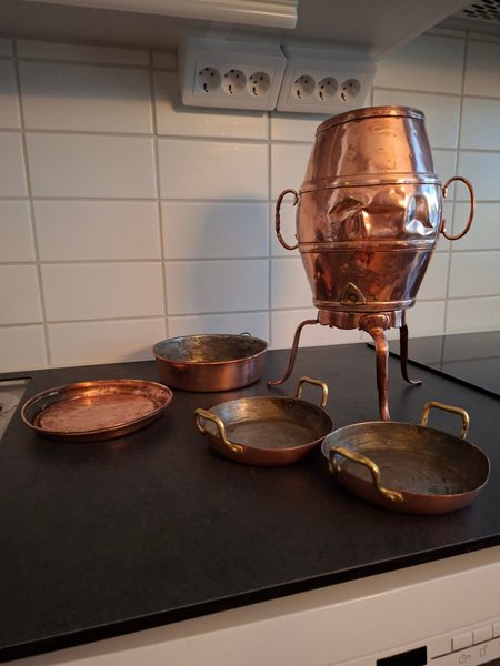 Ett set med kopparföremål, inklusive en stor kopparbehållare på stativ och flera mindre kopparkärl. Föremålen är lämpliga för dekoration.