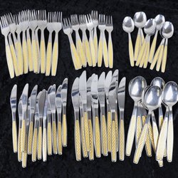 Bruksslitage, inklusive en del fläckar och ytsmuts. Gräddkannan har vita märken på undersidan. Kaffekannan har en buckla på ena sidan och locket sitter något löst. Sockerskålen står lite snett. Var god se bilder.
