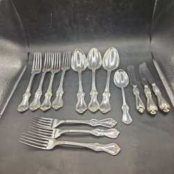 Bestick i vad jag tror är nysilver. Skick enligt bild, en del slitage men ändå fina. Kan behöva putsas.