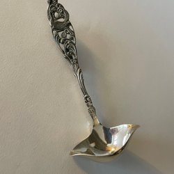 Set med 12 skedar från Hallbergs. Skedarna har olika dekorativa toppar och kommer i en presentask med blått foder.