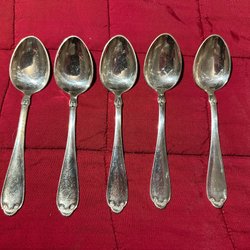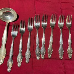 Blandade nysilver bestik från bla Prima NS Alp. Setet innehåller olika typer av bestick, inklusive skedar, slev och tårtkniv. Märkningar som "Prima NS Alp", "Prima Nysilver", "NM80", "PZN", "40 NM" och "20" finns på besticken.