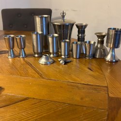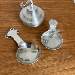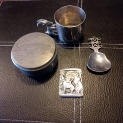 Ett paket med föremål i Svenskt Tenn och Skandia tenn. Fatet går att hänga upp på väggen. Ett av snapsglasen är inte helt runt i formen
