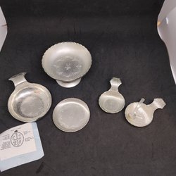 Ett paket med föremål i Svenskt Tenn och Skandia tenn. Fatet går att hänga upp på väggen. Ett av snapsglasen är inte helt runt i formen