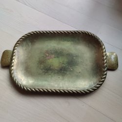 Föremålet är sannolikt ett litet fat, möjligtvis en antik mässingsaskkopp eller ett litet samlarobjekt. Material: Fatet är tillverkat av mässing, vilket framgår av dess gyllene färg och de mörkare fläckarna av patina och oxidation. Design: Det har en fyrkantig form med rundade hörn och en dekorativ rep- eller tvinnad kant. Skick: Ytan visar tydliga tecken på ålder och slitage, med märken och missfärgningar som är vanliga för åldrad, obehandlad mässing. Användning: På grund av sin storlek och form kan det ha använts som en askkopp, ett litet fat för smycken, nycklar eller som en dekorativ prydnad.