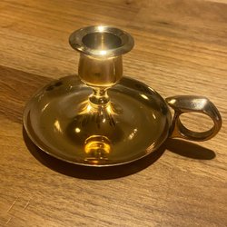 Liten ljusstake på fat - mässingsliknande.