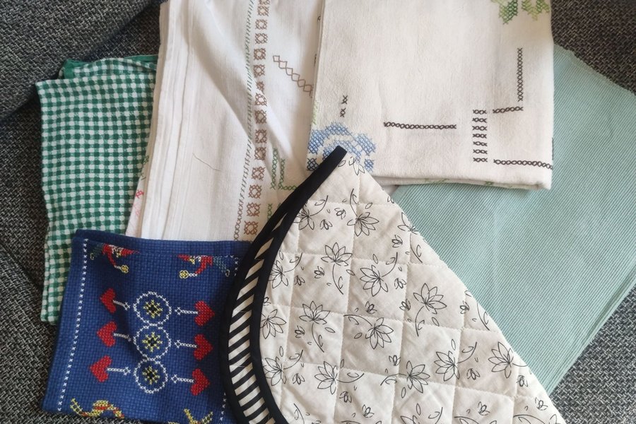 Ett set med diverse textilier som inkluderar broderade dukar, en grön-vit rutig kökshandduk och ett grytunderlägg.