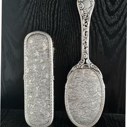 Silverfärgad fruktskål med dekorativa detaljer. Höjden är cirka 16 cm och diametern är cirka 27 cm. Se alla bilder och alla mina annonser.