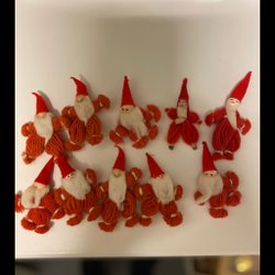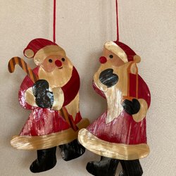 Två stycken julgranspynt i form av tomtar. Den ena tomten bär på en säck och har en käpp. Den andra tomten bär också på en säck