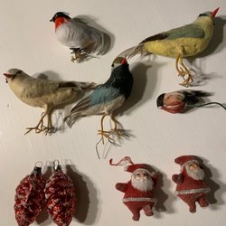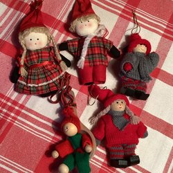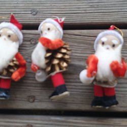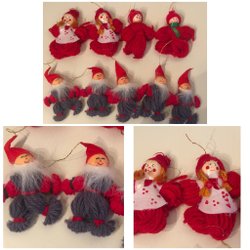 Två stycken julgranspynt i form av tomtar. Den ena tomten bär på en säck och har en käpp. Den andra tomten bär också på en säck